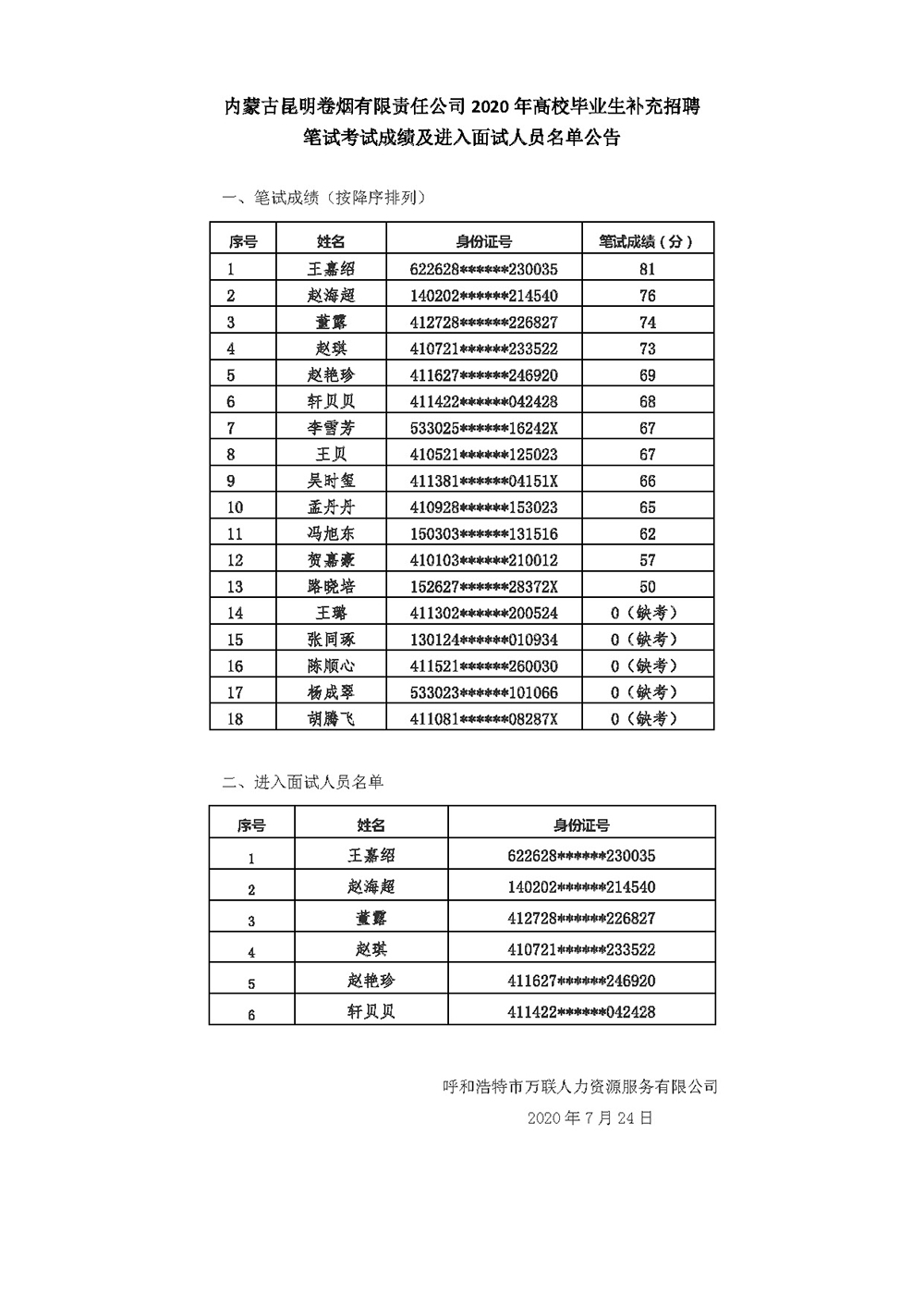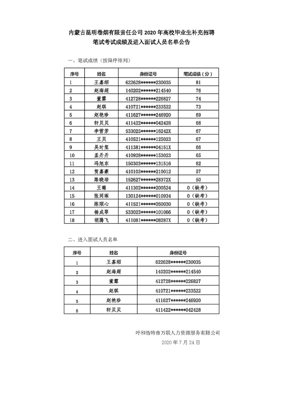 內(nèi)蒙古昆明卷煙有限責(zé)任公司2020年高校畢業(yè)生補充招聘筆試考試成績及進入面試人員名單公告