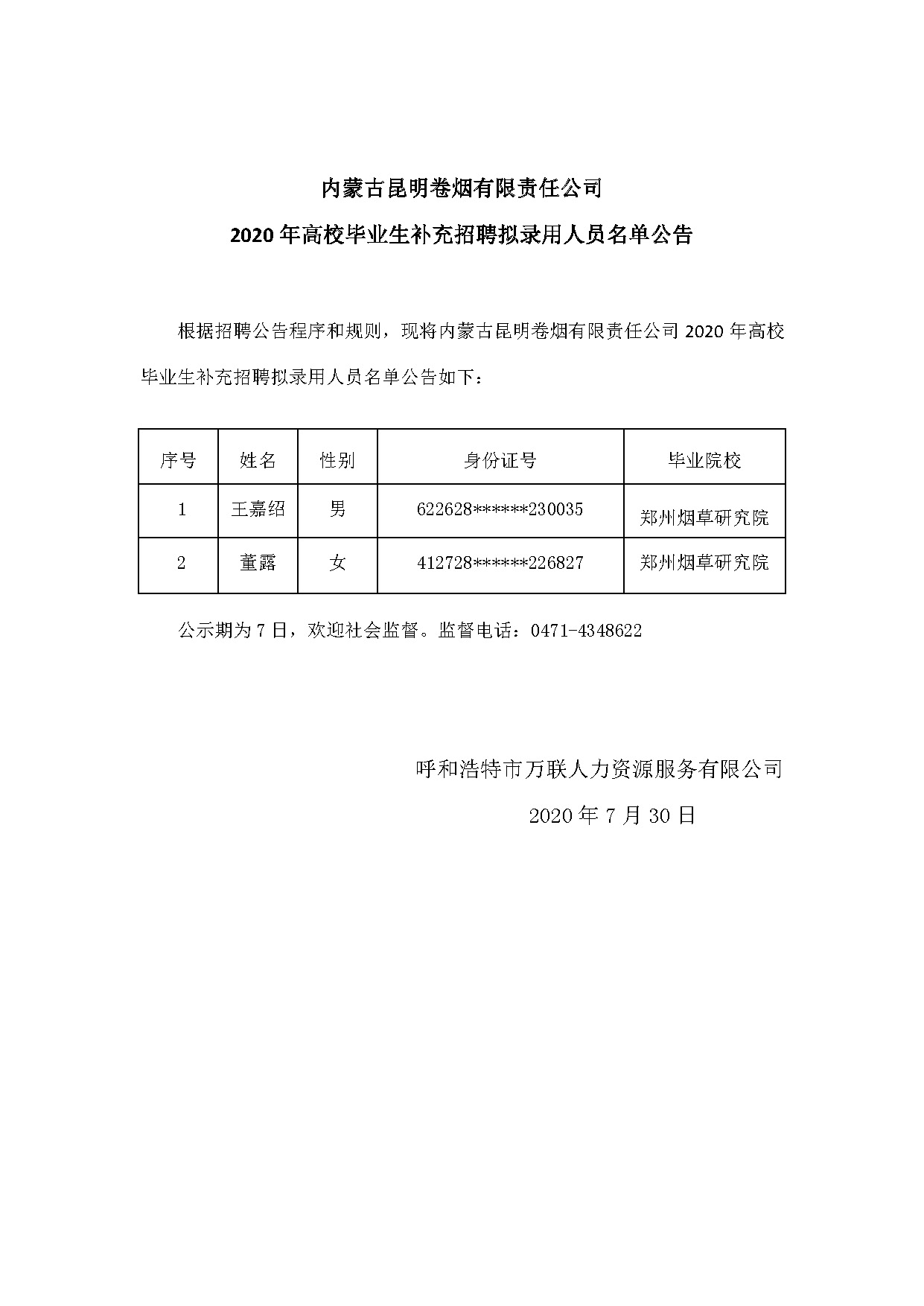 內(nèi)蒙古昆明卷煙有限責任公司2020年高校畢業(yè)生補充招聘擬錄用人員名單公告